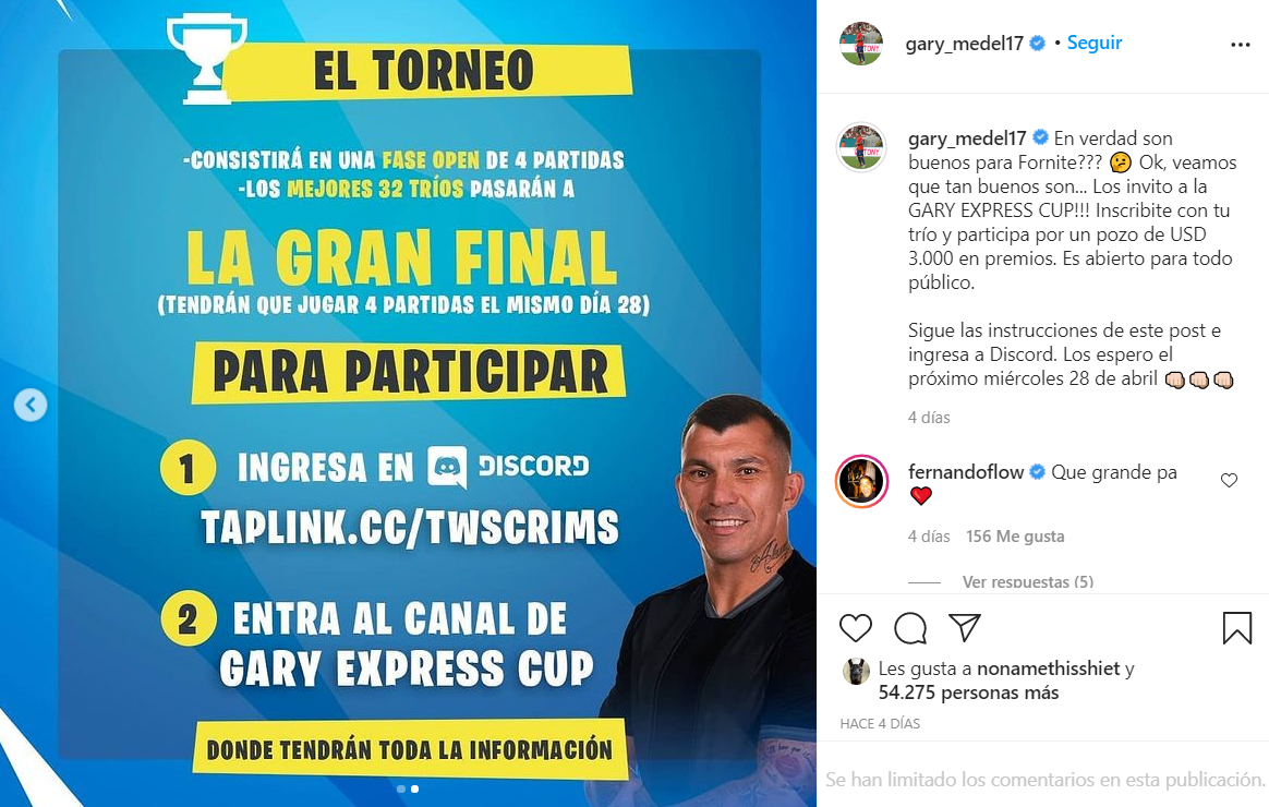 «En verdad son buenos para Fornite??? 🤔 Ok, veamos que tan buenos son… Los invito a la GARY EXPRESS CUP!!! Inscribite con tu trío y participa por un pozo de USD 3.000 en premios. Es abierto para todo público«, puso en su cuenta de Instagram.