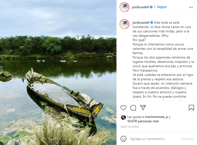«Este bote se está hundiendo, lo dice Annie Lenox en una de sus canciones más lindas, pero a la vez desgarradoras. Why. ¿Por qué? Porque lo intentamos como pocos valientes con la necesidad de armar una familia. Porque los dos pajarones veníamos de lugares hostiles, desamores insípidos y lo único que queríamos era paz y armonía. Pero fracasamos» comenzó escribiendo Jordi.