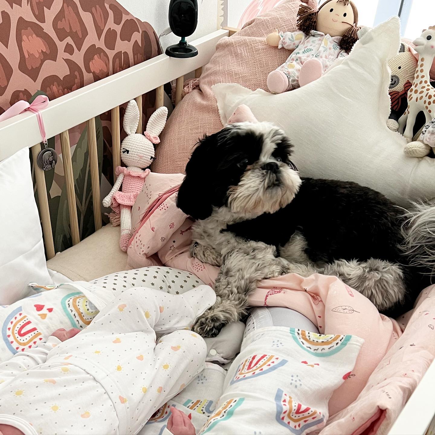 «Mi @upi_feroz cuidando a nuestra hija a sol y sombra, los amo con todo mi corazón ❤️» escribió junto a la fotito donde aparece la mascota acostada en la cuna junto a la bebé.