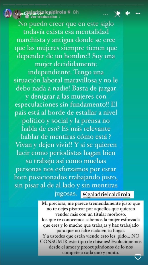 «Basta de juzgar y denigrar a las mujeres con especulaciones sin fundamento! El país está al borde de estallar a nivel político y social, y la prensa no habla de eso? Eso más relevante hablar de mentiras como esta?», agregó Gala Caldirola.