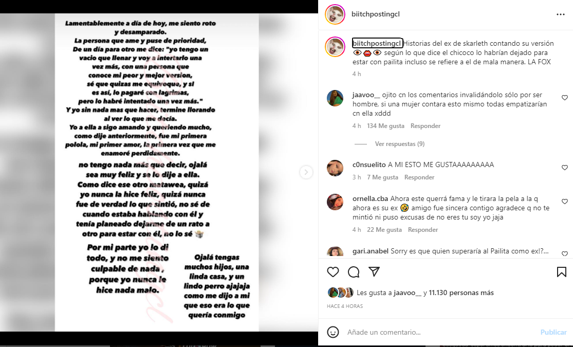 A lo que partió, “Ja, ja, ja, gente comentando como si viviera con nosotros, la Skarleth hizo mas que cualquier mina a hecho por mí, nos conocimos antes de todo esto que estoy viviendo, a pesar de lo que pasó nunca nos tuvimos mala, ustedes fueron los que agrandaron todo y armaron sus expectativas”.