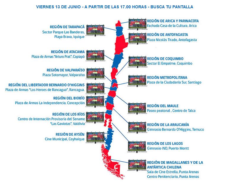 Para ello, el Ministerio del Deporte instalará 15 pantallas gigantes en todas las capitales regionales del país, para que los hinchas que no alcancen a llegar hasta su hogar puedan presenciar el primer partido de la selección chilena.