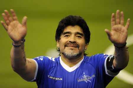 BUENOS AIRES, ARGENTINA - OCTOBER 16: Diego Maradona greets the fans during a soccer match between Argentina and Uruguay in tribute to Fernando Caceres, victim of an assault on October 16, 2010 in Buenos Aires, Argentina. Maradona organized this match to help Caceres to continue with his recovery in Cuba. (Photo by Richard Rad/LatinContent/Getty Images)