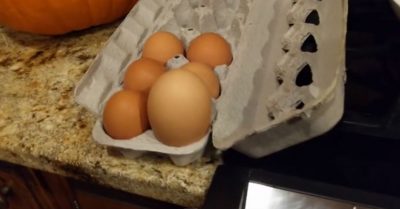 El huevo de gran tamaño que puso la gallina tenía en su interior tres yemas. Aunque no se ve en el video, seguro terminó en un muy buen desayuno para esta familia.