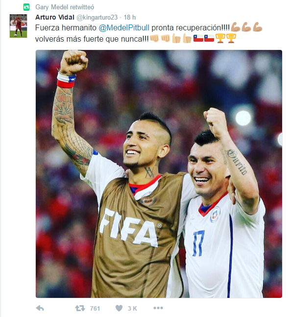 Luego de la lesión que enfrenta Gary Medel, que lo dejará un tiempo fuera de las canchas, el Rey Arturo quiso darle todo su apoyo a través de su cuenta de Twitter:
