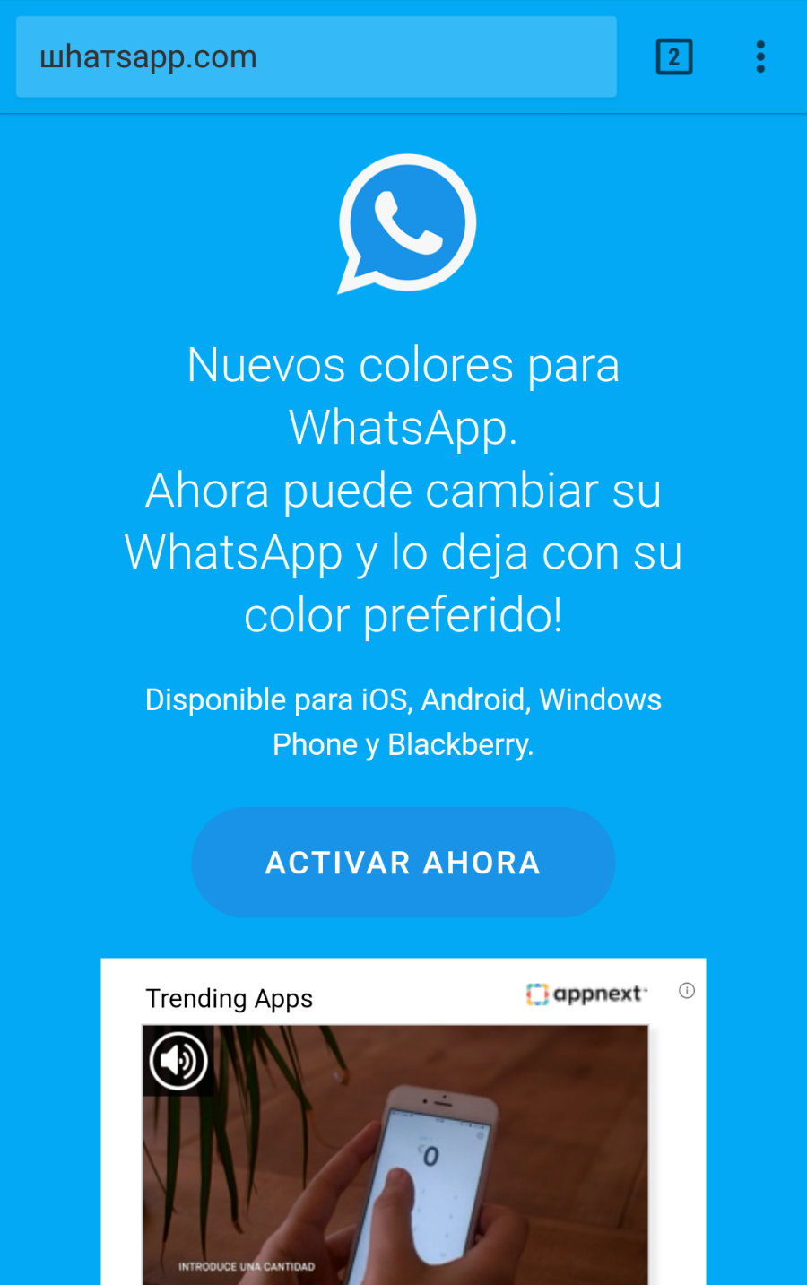 Se trata de una página web con un logo y apariencia igual al de WhatsApp, pero azul en vez de verde, y con un nombre muy parecido: шһатѕарр.com.