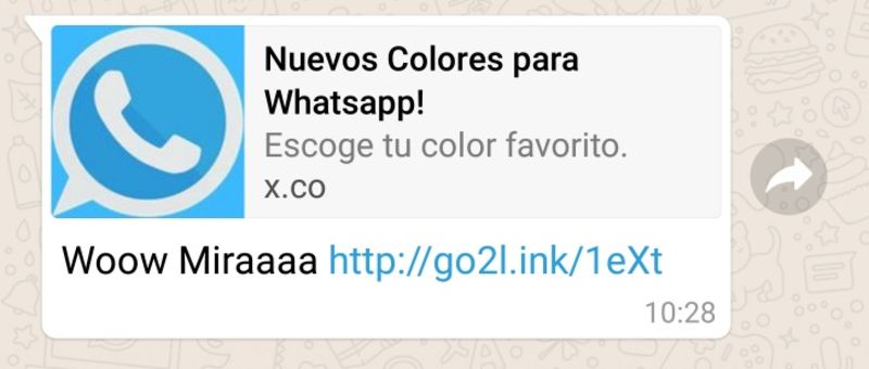 Si lo compartes, tus contactos recibirán un mensaje que dice «amo a los nuevos colores para WhatsApp» junto a la dirección URL falsa. Después de enviar esta «invitación» debes activar un enlace, luego aparecerá un mensaje: los nuevos colores de WhatsApp solo están disponibles para la aplicación de escritorio.