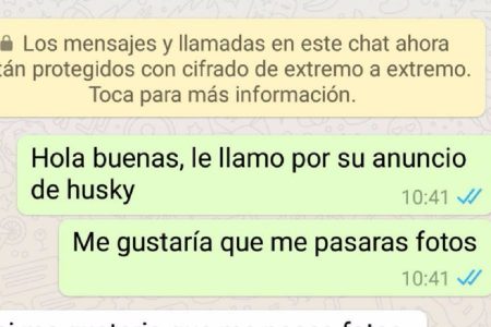 Lola quería adoptar un perro husky, por lo que le escribió por WhatsApp al hombre que los regalaba: «Hola, buenas, le llamo por su anuncio de husky», comenzó diciendo. «Me gustaría que me pasaras fotos», continuó.