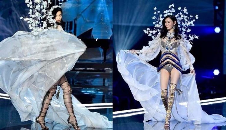 Se trata de la supermodelo china Ming Xi, quien mientras desfilaba se resbaló y cayó de rodillas frente al público. La peor parte, es que debido a la estructura que adornaba su espalda, no pudo levantarse de inmediato y estuvo en el piso durante varios segundos hasta que otra modelo se acercó a ella para levantarla.
