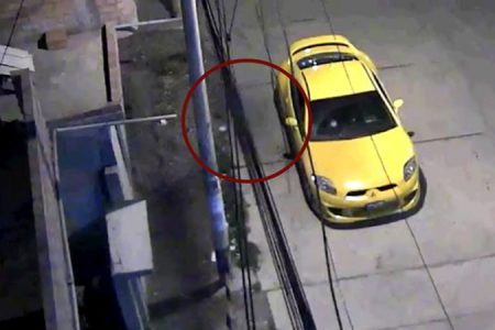 Mientras se esperaba la llegada de las autoridades al lugar, una sombra apareció de la nada. Luego de ver el video nuevamente, en las imágenes se nota una mancha en la parte izquierda en el tejado de una vivienda, hasta que un momento a otro se desplaza a la capota del vehículo para mantenerse por unos minutos hasta deslizarse por la calle colindante.