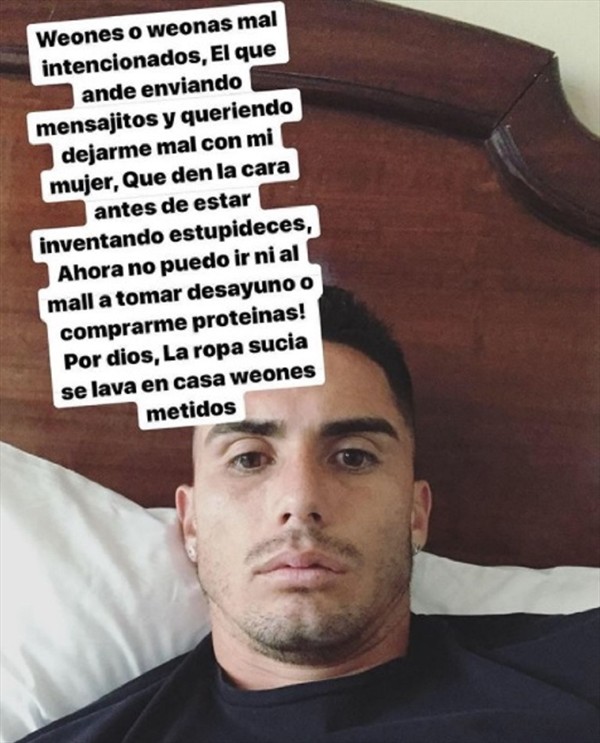 «Weones o weonas mal intencionados. El que ande enviando mensajitos o queriendo dejarme mal con mi mujer, que den la cara antes de andar inventando estupideces, ahora no puedo ni ir al mall a tomar desayuno o comprarme proteínas! Por diós, la ropa sucia se lava en casa, weones metidos», escribió en la red social.
