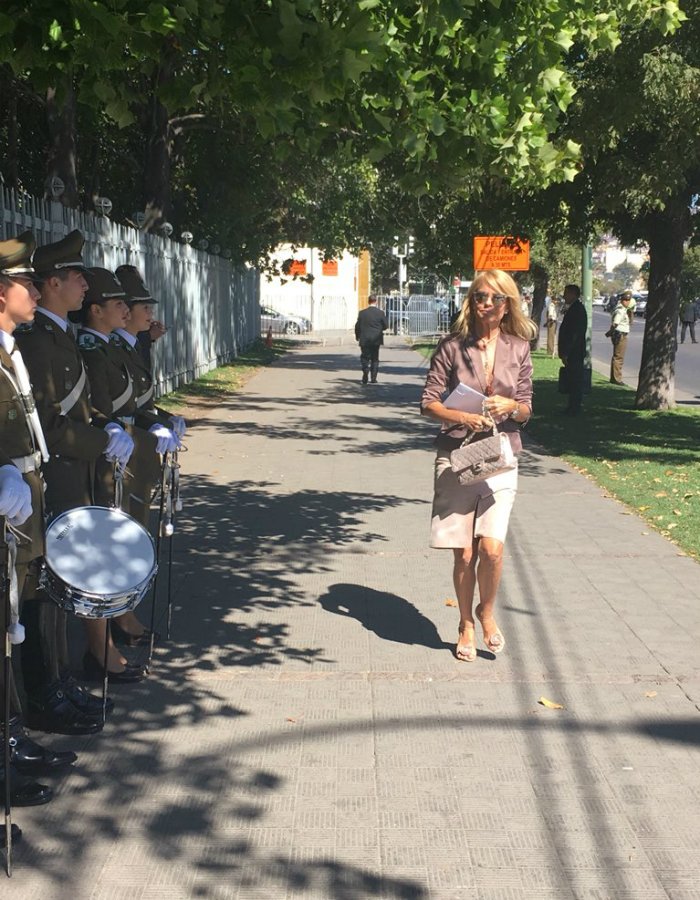 Quien fue invitada por el actual presidente Sebastián Piñera, lució un traje dos piezas, acompañado de una pequeña cartera y su rubia cabellera.