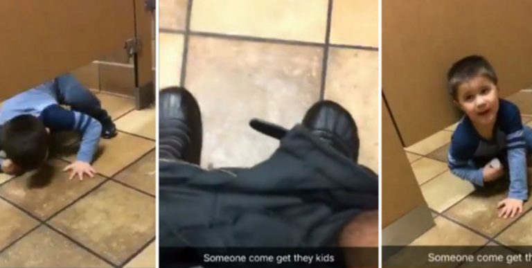 Andrew estaba tranquilo en uno de los cubículos del baño del restaurante Chick-fil-A cuando un niño se asomó debajo de su puerta y comienza a hablarle, preguntándole su nombre.