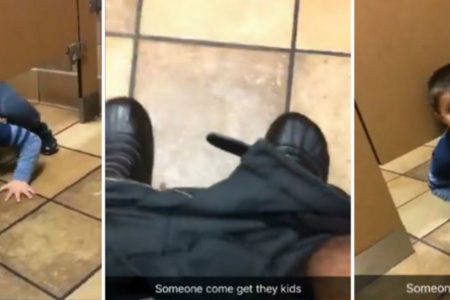 Andrew estaba tranquilo en uno de los cubículos del baño del restaurante Chick-fil-A cuando un niño se asomó debajo de su puerta y comienza a hablarle, preguntándole su nombre.