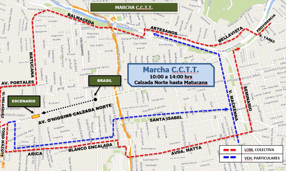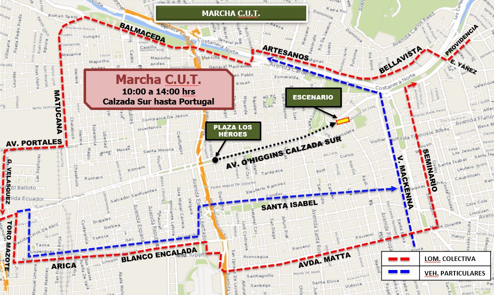 A las diez de la mañana, desde Plaza Los Héroes y desplazándose por La Alameda hasta Portugal, la CUT realizará su marcha, mientras que de Brasil a Matucana a la misma hora, marchará el CCTT, esperando que ambas terminen a eso de las dos de la tarde.