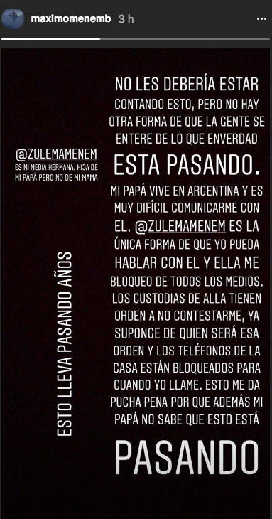 A través de su cuenta de Instagram, el chiquillo de 14 años aseguró que hace años no puede ver a su papá, ya que su media hermana Zulema no se lo permite. “No les debería estar contando esto, pero no hay otra forma de que la gente se entere de lo que en verdad está pasando. Mi papá vive en Argentina y es muy difícil comunicarme con él. Zulema Menem es la única forma de que yo pueda hablar y ella me bloqueó de todos los medios”, escribió.