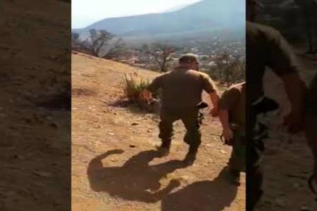 Sin embargo, la cámara apunta hacia lo alto del cerro, desde donde viene corriendo otro uniformado a toda velocidad, quien termina cayendo violentamente al piso y deslizándose unos cuantos metros, lo que provoca la caída de su compañero.
