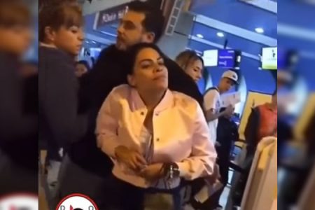 Resulta que un cara de palo de nacionalidad colombiana, estaba en el aeropuerto a minutos de embarcar un plácido viaje quien sabe dónde con su amante. Lo que él no sabía, es que mientras hacia fila con la otra, su esposa llegaría para pillarlo en plena.