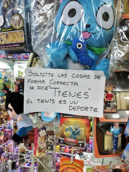 Y es que un locatario de nombre desconocido, colgó en la vitrina de su negocio un papel con la siguiente petición: «Solicite las cosas de forma correcta. Se dice ‘tienes’. El tenis es un deporte”.