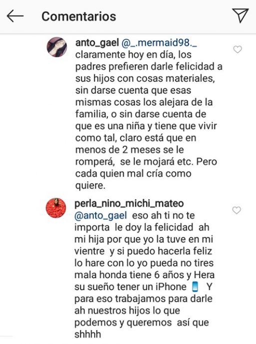 Las imágenes hicieron que los más mala onda le comentaran cosas como: «es muy chica para un regalo como ese», «¿no será mucho?», «como que na que ver», se podía leer, por lo que la ex rostro de Canal 13 decidió responder así: “Le doy felicidad a mi hija porque yo la tuve en mi vientre. Si puedo hacerla feliz, lo haré con lo que yo pueda… Para eso trabajamos, para darles a nuestros hijos lo que podemos y queremos”.
