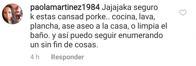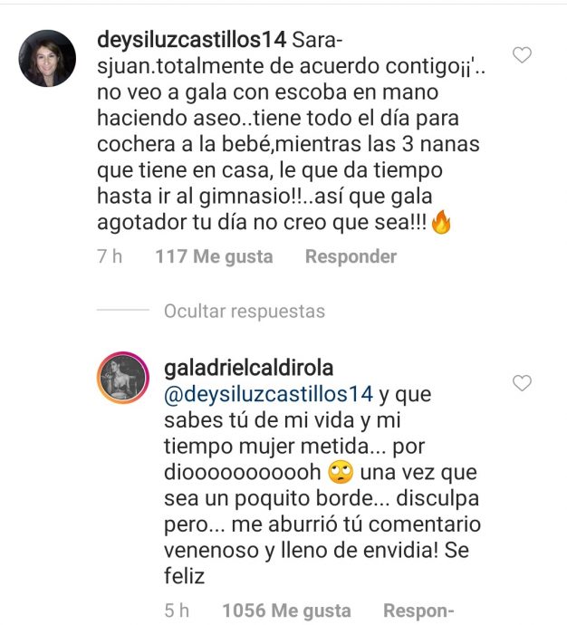 Pero en vez de que sus seguidores, sobre todo las que son mamitas corroboraran sus palabras, recibió en cambio críticas por hablar sin saber lo que es efectivamente estar cansada. «Gala y eso que tienes como tres nanas», «cuando trabajes ocho horas diarias y llegues por las noches a tu casa, habla», «te cansas de no hacer nada, ni siquiera limpias y ordenas», le escribieron.