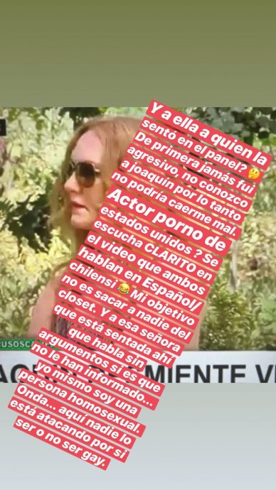Más tarde, los chiquillos decidieron responder a través de Instagram: “¿Y a ella quién la sentó en el panel? De primera, jamás fui agresivo. No conozco a Joaquín, por lo tanto no podría caerme mal. ¿Actor porno de Estados Unidos? Se escucha clarito en el video que ambos hablan en español/chilensi… Mi objetivo no es sacar a nadie del clóset. Y a esa señora que está sentada ahí, que habla sin argumentos, si es que no le han informado, yo mismo soy una persona homosexual. Onda, aquí nadie lo está atacando por ser o no ser gay”, dijo Leo por su lado.