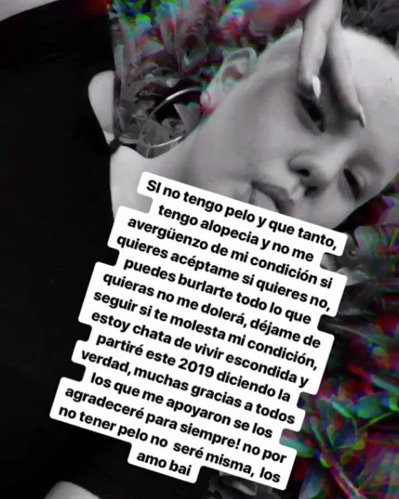 Todo esto porque antes de su publicación, la pequeña publicó una foto en la misma red social para mostrarse sin cabello y asegurar que eso no la hará ser otra persona: “Sí, no tengo pelo y qué tanto. Tengo Alopecia y no me avergüenzo de mi condición. Si quieres acéptame, si quieres no. Puedes burlarte todo lo que quieras, no me dolerá, déjame de seguir si te molesta mi condición. Estoy chata de vivir escondida y partiré este 2019 diciendo la verdad. Muchas gracias a todos los que me apoyaron, ¡se los agradeceré para siempre!», escribió.