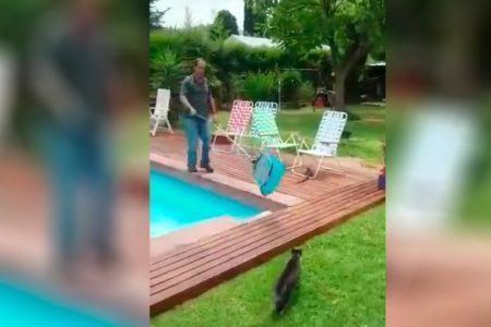 En Argentina un registro ha causado la risa de todos, debido a que un hombre intenta “salvar” a una iguana que se metió en su piscina. Todo parece tranquilo, hasta que aparece su gato.