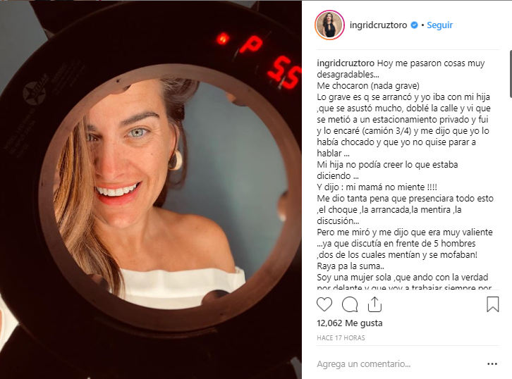 Hace algunas horas Ingrid Cruz usó su cuenta de Instagram para contar que había tenido que pasar por una desagradable situación junto a su hija en plena calle, ya que luego de que la chocaran, y se dieran a la fuga, siguió al responsable para pararlo en seco por cara de nalga.