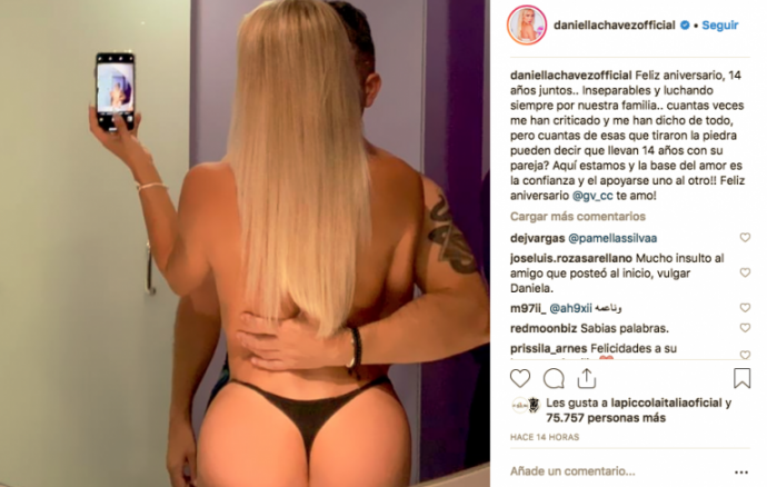 Posando en el baño, en una foto que para muchos dejó bastante que desear, la modelo escribió: «Feliz aniversario, 14 años juntos.. Inseparables y luchando siempre por nuestra familia. ¿Cuántas veces me han criticado y me han dicho de todo, pero ¿cuántas de esas que tiraron la piedra pueden decir que llevan 14 años con su pareja?. Aquí estamos y la base del amor es la confianza y el apoyarse uno al otro ¡Feliz aniversario @gv_cc te amo!», escribió.