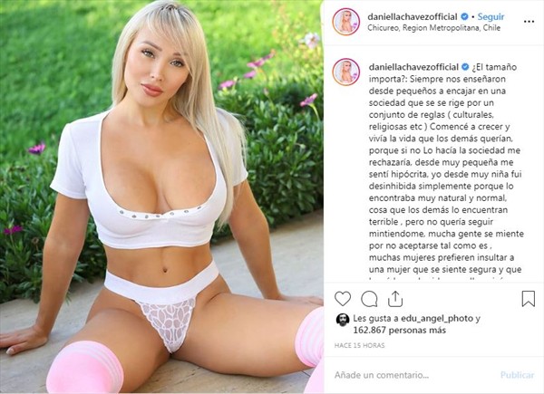 No cabe duda que Daniella Chávez es una de las chilenas más populares en redes sociales, y aprovechó su tribuna para hacer una sentida reflexión sobre una pregunta que usualmente se toma para la broma: «¿El tamaño importa?» solamente que desde una mirada femenina.