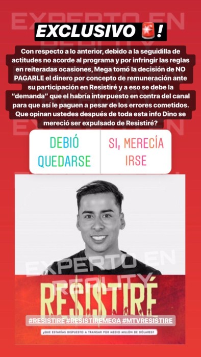Luego de este altercado, la producción de «Resistiré» decidió sacar a Dino del espacio producido por Mega y MTV, debido a que infringió múltiples reglas que se tenían establecidas.