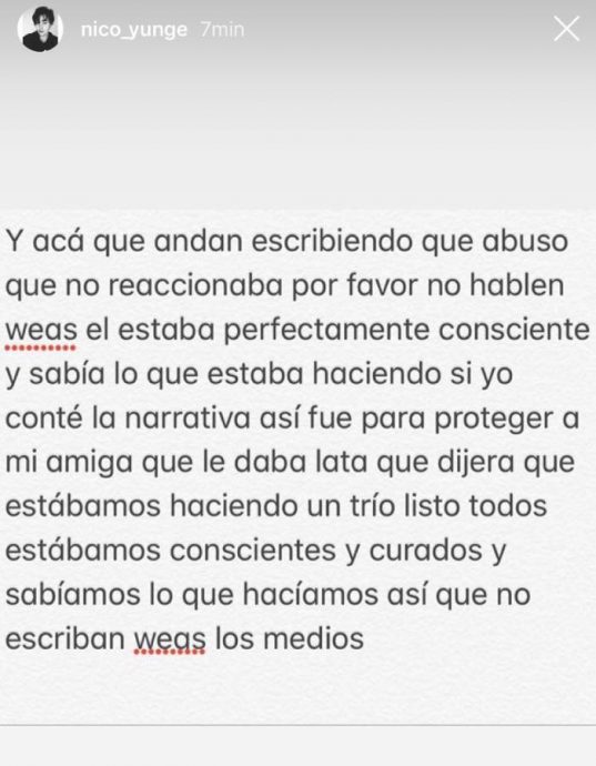 «Acá andan escribiendo que abuso, que no reaccionaba. Por favor, no hablen hue…, él estaba perfectamente consciente y sabía lo que estaba haciendo (sic)» fue lo primero que escribió el ex chico reality.