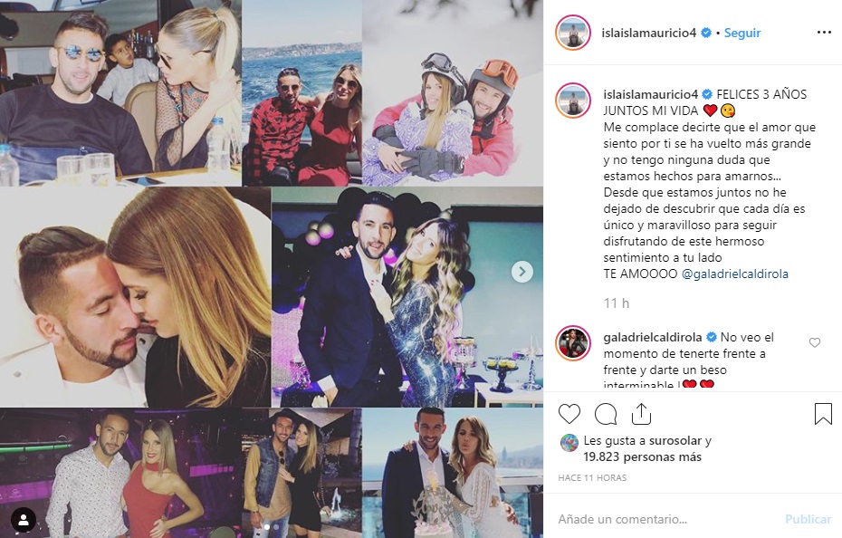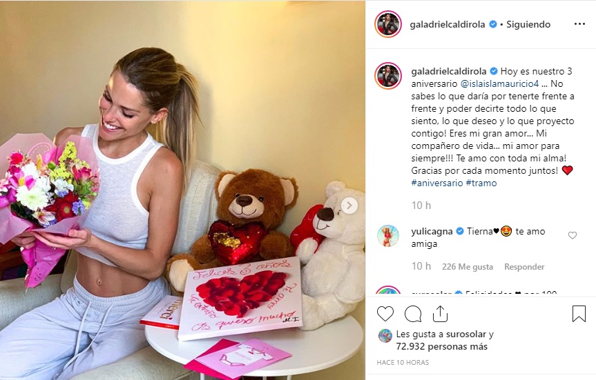 «Hoy es nuestro 3 aniversario @islaislamauricio4… No sabes lo que daría por tenerte frente a frente y poder decirte todo lo que siento, lo que deseo y lo que proyecto contigo! Eres mi gran amor… Mi compañero de vida… mi amor para siempre!!! Te amo con toda mi alma! Gracias por cada momento juntos!» escribió la ex chica reality, quien posó junto a los regalos que su esposo le hizo llegar en esta importante fecha.