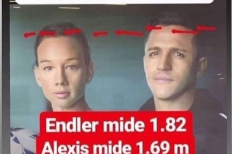 En la imagen se puede ver al niño maravilla ligeramente más alto que la capitana de la selección femenina. Cuando en la realidad la arquera nacional mide 1 metro y 82 centímetros, a diferencia de Sánchez, quien llega al metro sesenta y nueve de estatura.