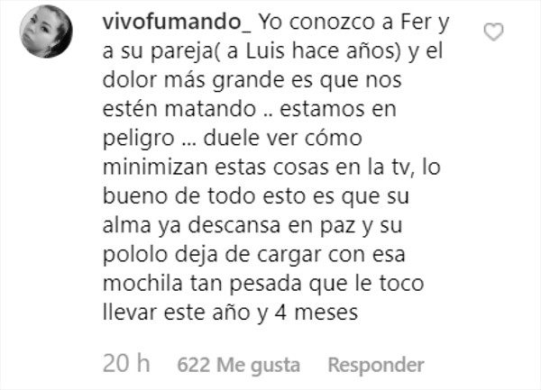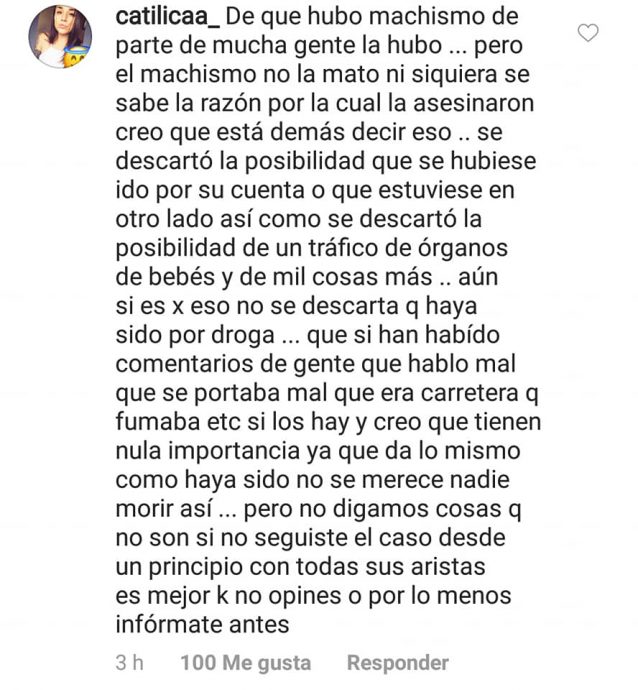 «PD: Da igual qué hizo o qué no. Nadie merece morir ¡ni menos con un hijo adentro! Me valen mierda sus comentarios weones que dicen ‘ella fue a buscar droga’ o qué sé yo. Gente de mierda. Estoy con ella y con miles de mujeres que son abusadas a diario. Si necesitan algo, pueden hablar conmigo. ¡Aquí tienen un apoyo!» finalizó.