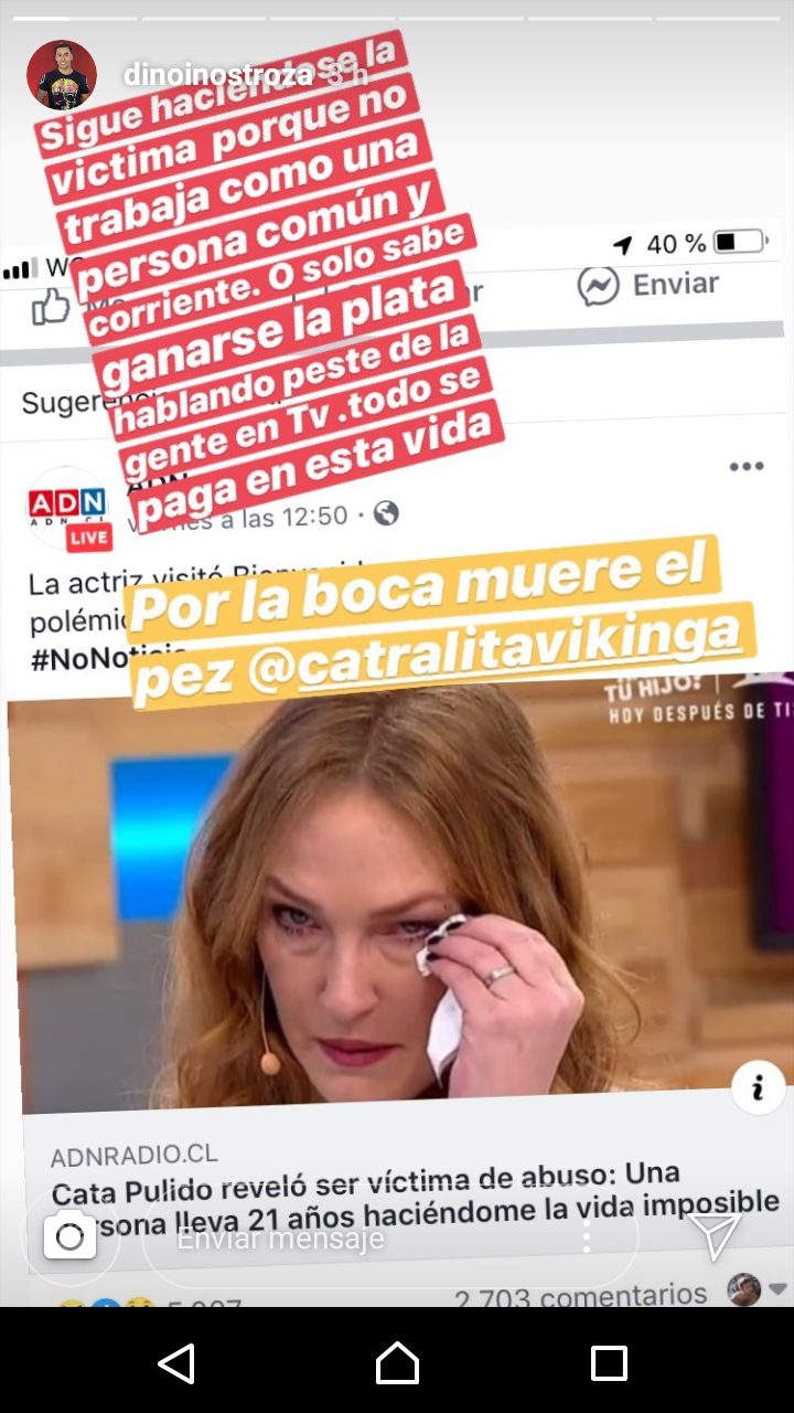 «Sigue haciéndose la víctima, porque no trabaja como una persona común y corriente. O solo sabe ganarse la plata hablando peste de la gente TV. Todo se paga en esta vida» agregó Dino Inostroza en referencia a Dino Inostroza.