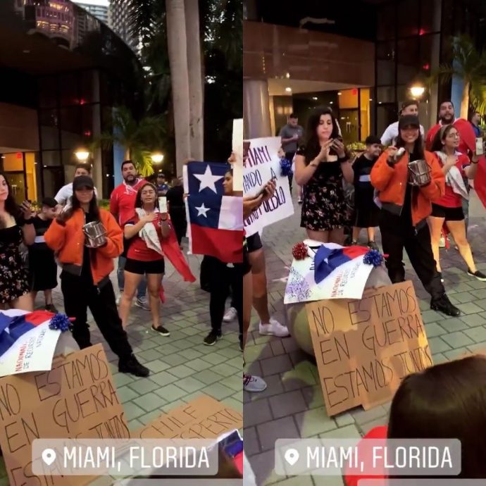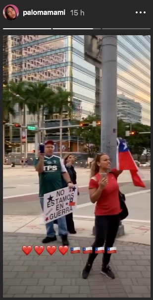 A través de Instagram Paloma Mami hizo un llamado a una «Marcha Mundial por Chile», la cual tendría lugar a las 12:00 hrs. Desde Miami, Estados Unidos, la intérprete de «No te enamores de mí» salió a las calles y se unió a un grupo de personas en un cacerolazo masivo.