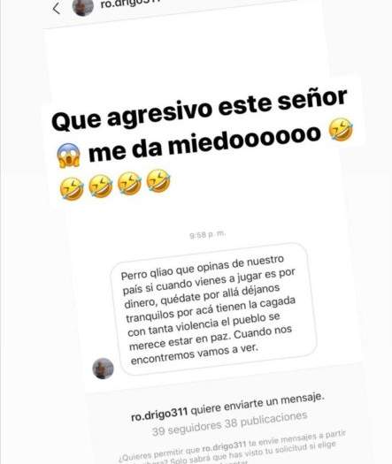 «Perro cu… que opinas de nuestro país si cuando vienes a jugar es por dinero, quédate allá y déjanos tranquilos. Por acá tienen la cagada con tanta violencia. El pueblo se merece estar en paz. Cuando nos encontremos nos vamos a ver» escribió el sujeto a Gary Medel.