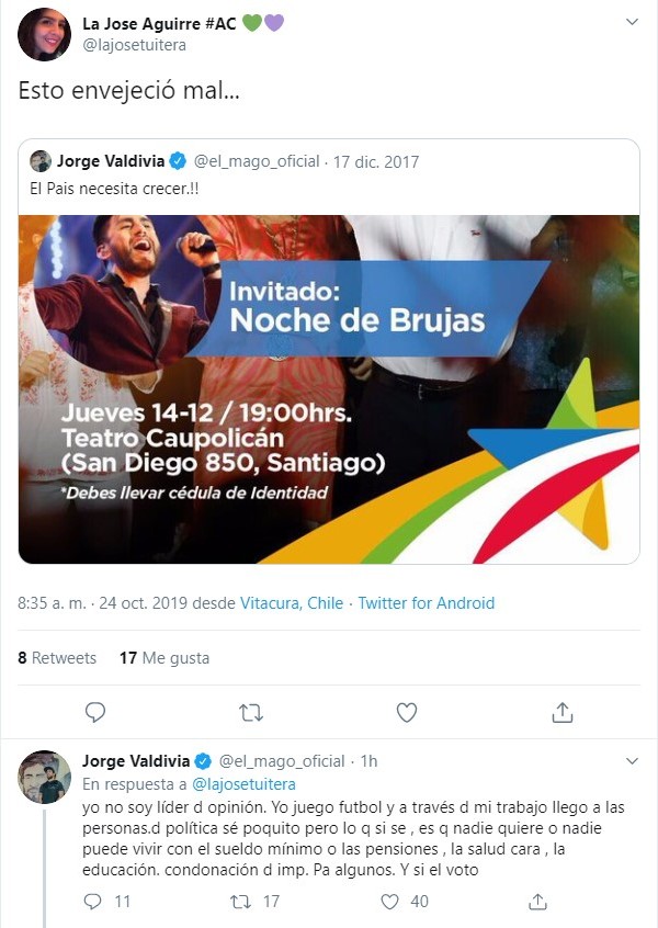 Precisamente sobre la contigencia nacional fue que Jorge Valdivia reaccionó ante una tuitera que lo encaró por apoyar la campaña de Sebastián Piñera. Recordando el día en que el «Mago» invitó a todos al cierre de campaña del hoy presidente, la usuaria escribió «esto envejeció mal…».