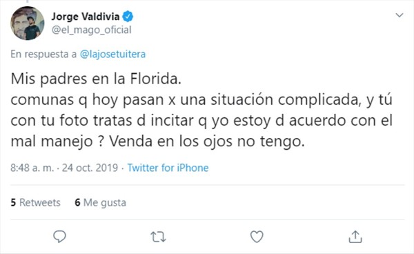 «Yo vivo acá igual, mi hermano vive en Puente alto, mis padres en La Florida, comunas que hoy pasan por una situación complicada, y tú con tu foto tratas de incitar que yo estoy de acuerdo con el mal manejo? Venda en los ojos no tengo», agregó el volante.