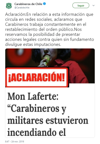 «En relación a esta información que circula en redes sociales, aclaramos que Carabineros trabaja constantemente en el restablecimiento del orden público. Nos reservamos la posibilidad de presentar acciones legales contra quien sin fundamento divulgue estas imputaciones» comentaron.