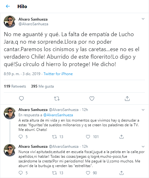 Pero al parecer las palabras de Jara no fueron del agrado de muchos, especialmente en Twitter, ya que se llenó de críticas por sus dichos. Y uno de los que saltó de inmediato a destrozarlo fue Álvaro Sanhueza, quien en la red social escribió: «No me aguanté y qué. La falta de empatía de Lucho Jara, que no me sorprende. Llora por no poder cantar. Paremos los cinismos y las caretas… ¡Ese no es el verdadero Chile! ¡Aburrido de este florerito! ¡Lo digo y qué! Su círculo de hierro lo protege».