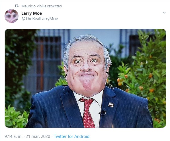 El futbolista nacional lo emplaza constantemente por no tomar medidas más radicales para frenar el contagio del virus y ahora, indirectamente lo volvió a hacer. Esto luego de que el conocido Larry Moe subiera una imagen de la autoridad de la cual todos se han burlado en redes sociales y la que Pinilla compartió en su cuenta.