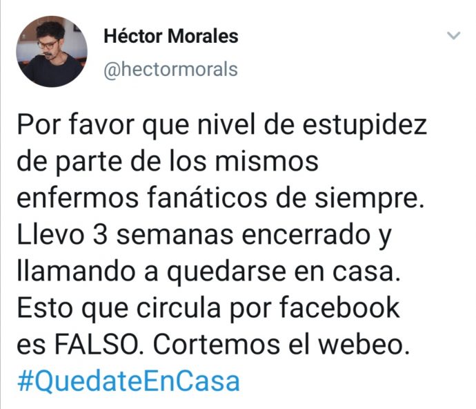 «Por favor, qué nivel de estupidez de parte de los mismos fanáticos de siempre. Llevo 3 semanas encerrado y llamando a quedarse en casa. Esto que circula en Facebook es FALSO. Cortemos el webeo. #QuedateEnCasa» señaló.