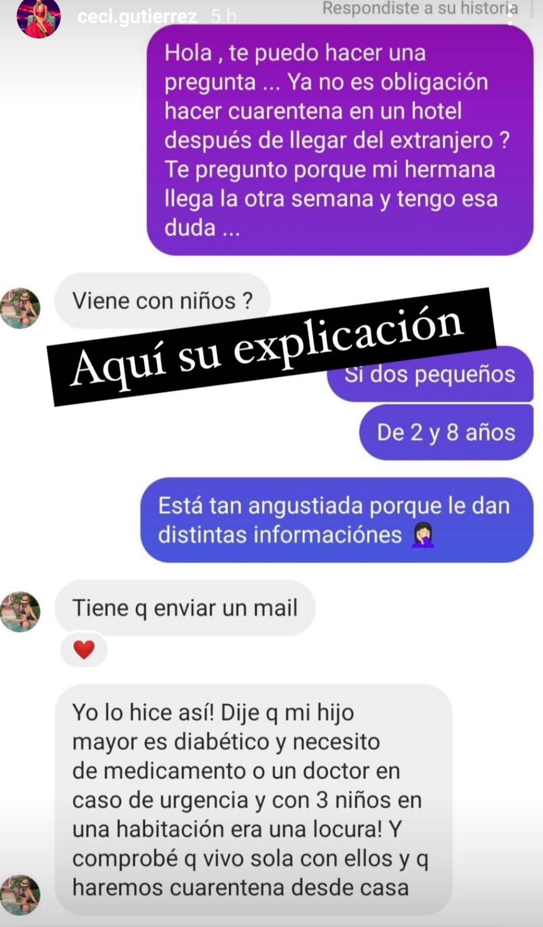 «Muchos usuarios me preguntaron por la familia de Arturo que también llegó de Europa con él. Tampoco fueron a una residencia sanitaria, ya que Marité acreditó que su hijo padece de diabetes, por lo tanto, podría necesitar atención médica de urgencia» afirmó Gutiérrez a través de sus historias de Instagram.