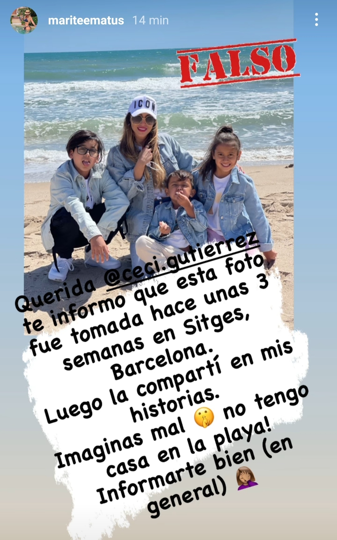 «Querida Cecilia Gutiérrez, te informo que esta foto fue tomada hace unas tres semanas en Sitges, Barcelona. Luego la compartí en mis historias. Imaginas mal, no tengo casa en la playa! Infórmate bien (en general)» fueron sus dichos.