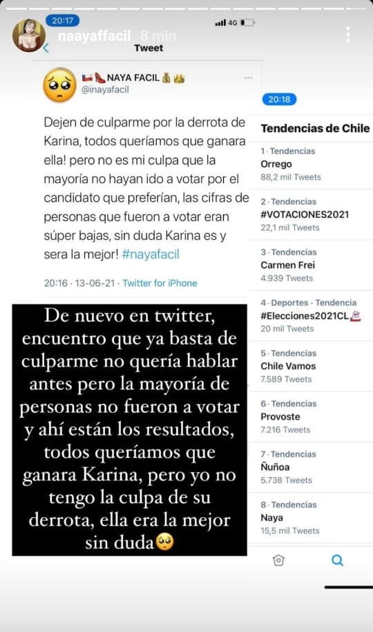 «De nuevo en Twitter, encuentro que ya basta de culparme no quería hablar antes pero la mayoría de personas no fueron a votar y ahí están todos los resultados, todos queríamos que ganara Karina, pero yo no tengo la culpa de su derrota, ella era la mejor sin duda» cerró Naya Fácil.