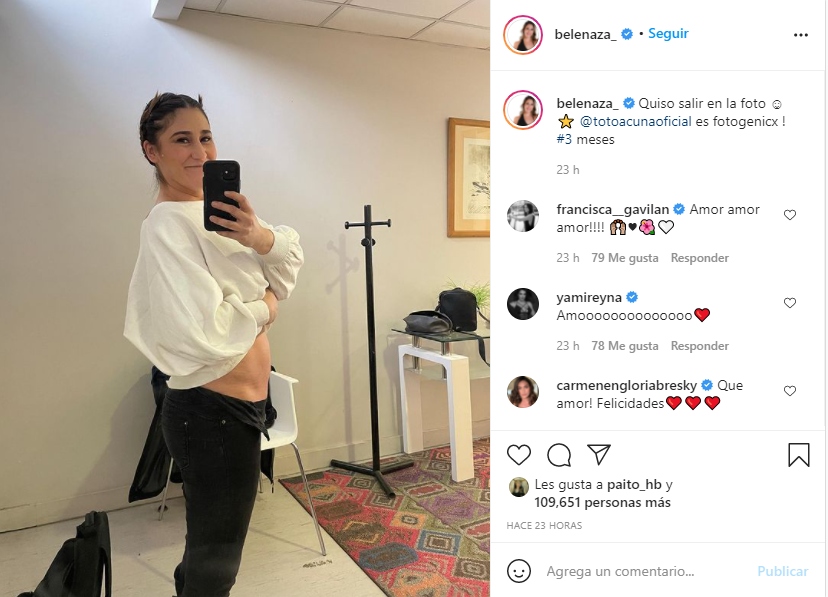 Y ahora ya pasados unos días de su anunció, Belén sorprendió al compartir la primera fotito mostrando su guatita de apenas tres meses. «Quiso salir en la foto. ¡Toto es fotogenicx» escribió la también actriz para acompañar la publicación.