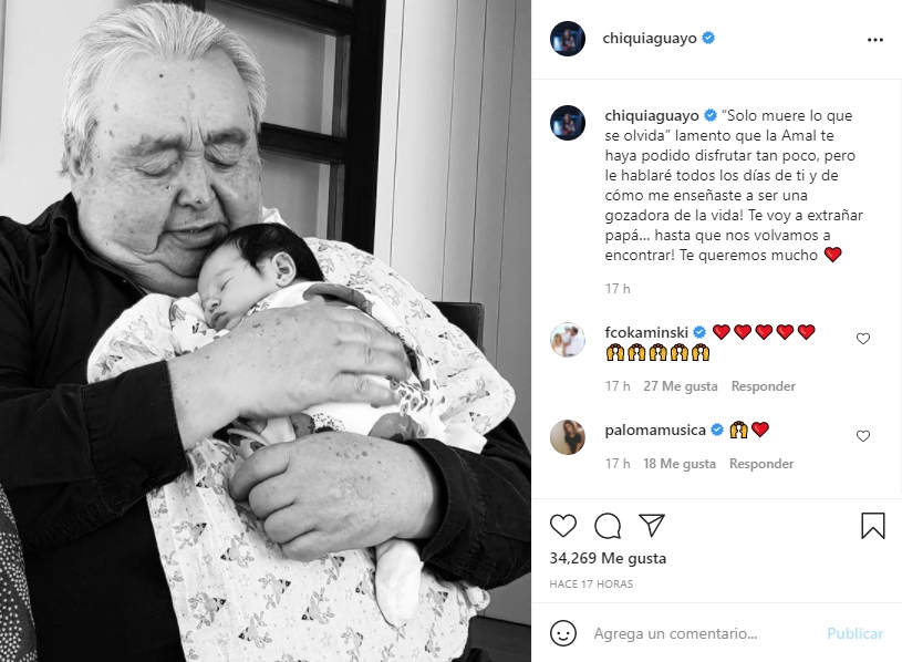La humorista compartió a través de la red social una postal en blanco y negro en la que aparece su papá posando con su nieta Amal, la primera hija que tiene junto a su esposo Karim Sufan, la que acompañó con un emotivo mensaje en el que lamentó que ambos no pudieran pasar más tiempo juntos.